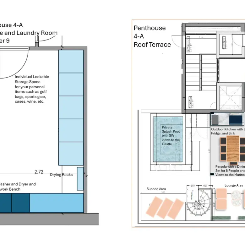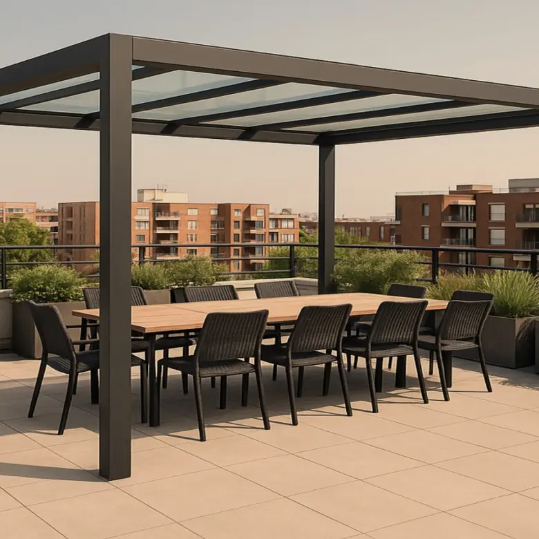 A new pergola structure defines the area, offering shade and comfort, while the fully equipped outdoor kitchen—complete with a large built-in barbecue and generous counter space—creates a seamless setting for outdoor dining and entertaining. Together, these elements transform the rooftop into a stylish outdoor living and dining room, perfect for hosting guests or enjoying quiet evenings with a view.