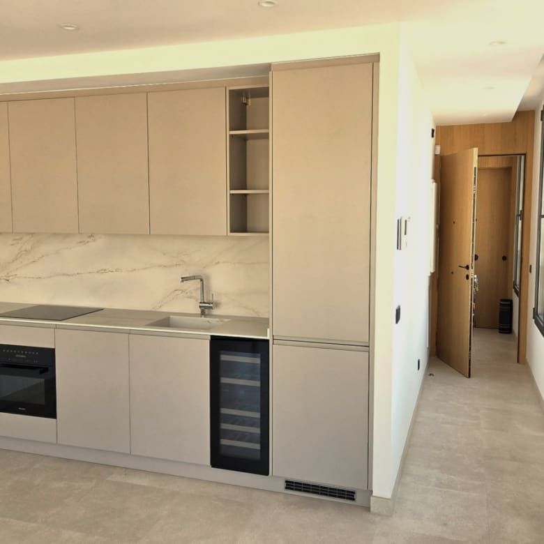 The Porcelanosa kitchen features top-brand appliances, a built-in wine cooler, and elegant finishes—ideal for both everyday living and sophisticated entertaining.
